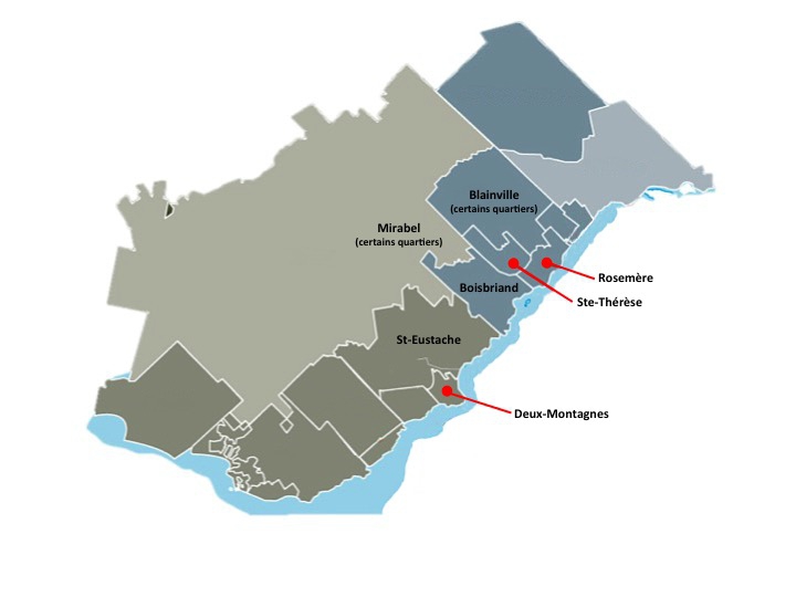 - Boisbriand, St-Eustache, Deux-Montagnes, Ste-Thérèse, Rosemère et certains quartiers