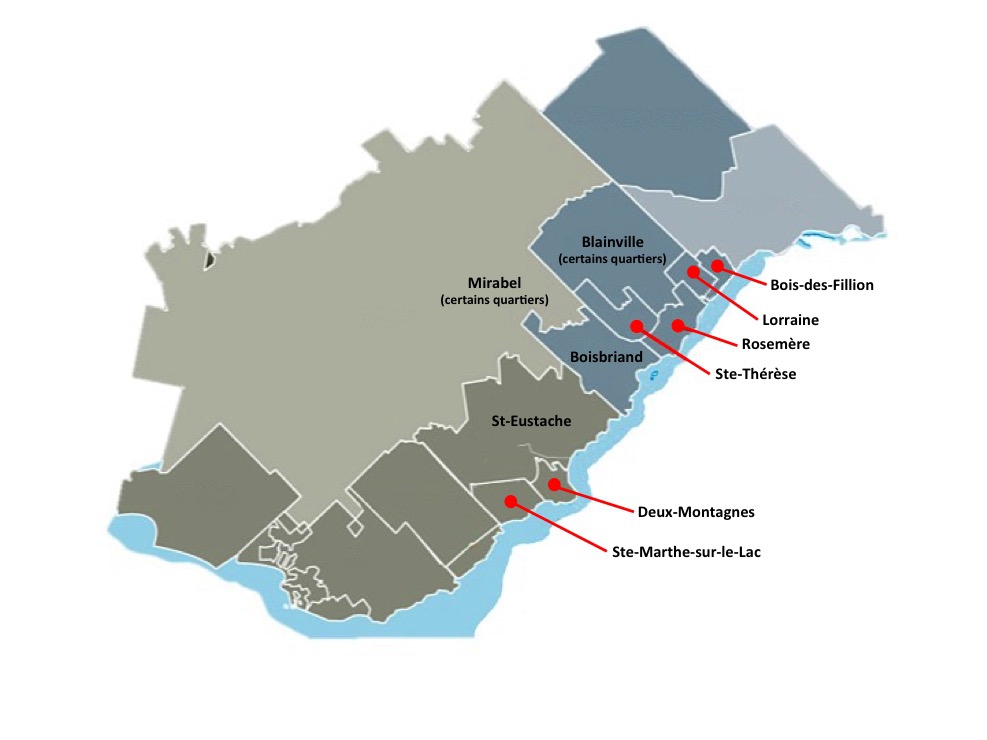 Sont incluses les villes de Boisbriand, St-Eustache, Deux-Montagnes, Ste-Thérèse et Rosemère, ainsi que les quartiers les plus au sud de Blainville et Mirabel.